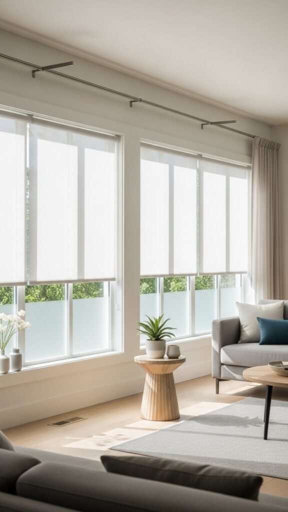 Install sheer solar shades to reduce glare while preserving views, or apply frosted privacy film to lower windows for seclusion without heavy curtains. Choose slim hardware, mount higher and wider, and keep lines clean to maximize light and a liberated vibe.