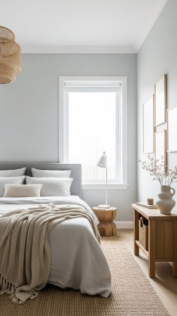 Choose a light, neutral palette for walls and the ceiling to make your bedroom feel larger, calmer, and more versatile. Pick soft matte finishes and cool whites to reflect light without glare, then layer texture—woven throws, sisal rugs, linen—so the space breathes.