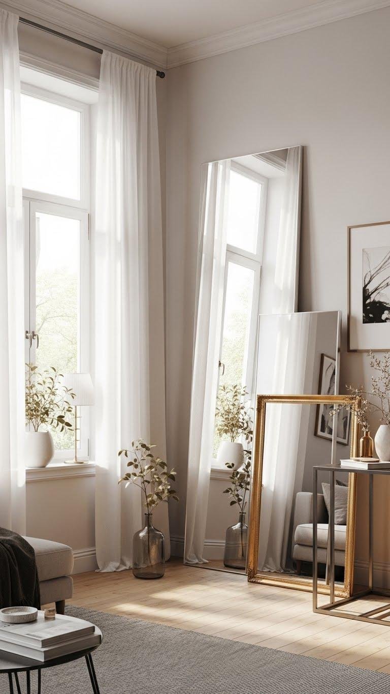 If you want to amplify light and create the illusion of more space, hang a large mirror opposite a window or along a narrow wall—its reflected daylight and sightlines instantly deepen the room. You’ll harness optical illusions to expand perception; choose minimalist shapes or bold antique frames for personality. Lean mirrors casually against walls, layer them for drama, and keep styling free and intentional.