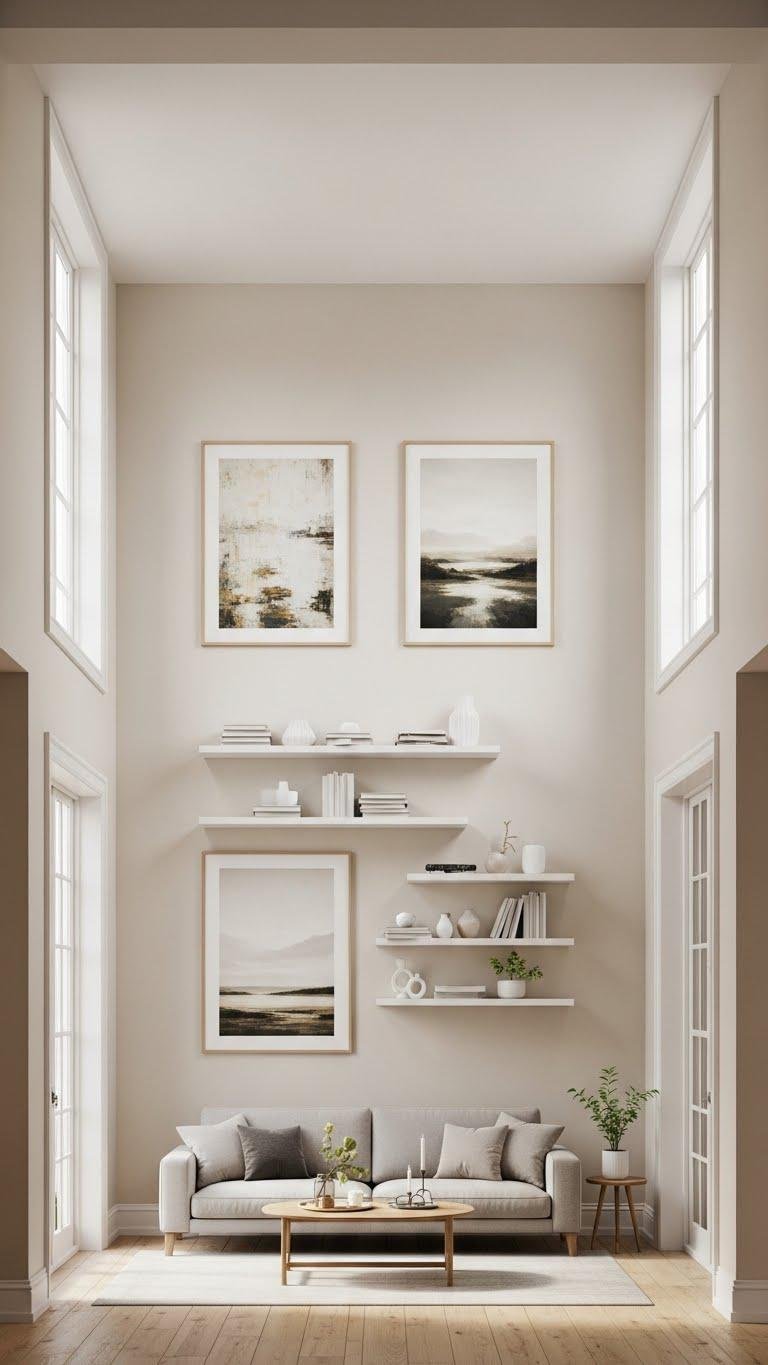 If you want the room to feel taller, hang artwork and shelves higher than usual so the eye travels upward and the ceiling reads as part of the space.