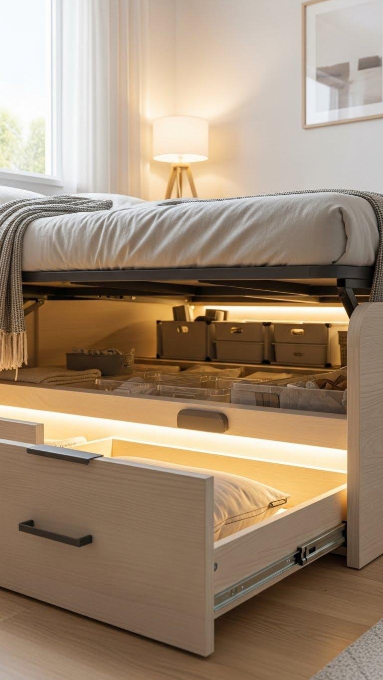 Use clear bins for seasonal rotation, add subtle under bed lighting for easy access, and choose modular pieces so you can rearrange freely, keeping the room open and clutter-free.