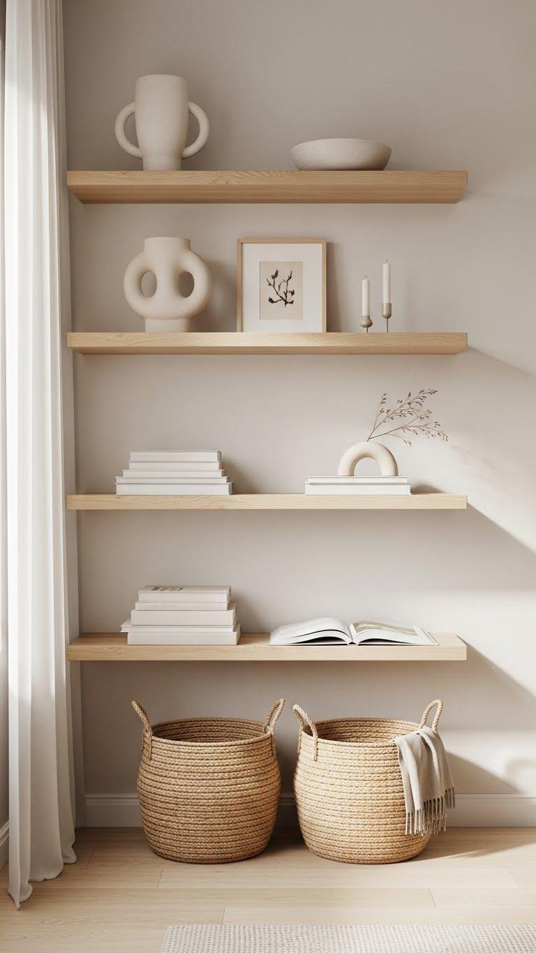While open shelving can make a room feel airy, keep it minimal and intentional so it doesn’t read as cluttered; curate a few statement pieces, a stack of books, and a couple of closed containers to balance display with storage. You’ll place an open book, curated objects, and airy baskets sparingly, edit often, and do seasonal rotations so shelves feel free, functional, and fresh.