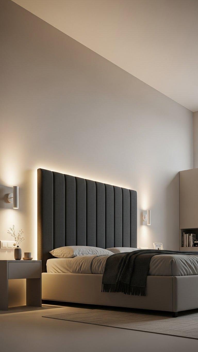 Choose a slim, bold piece with vertical tufting to accentuate height without bulk. Opt for an illuminated headboard or integrated sconces for layered light that frees floor space. You’ll create a calm, open vibe that’s stylish, functional, and liberating.