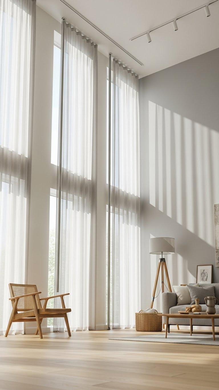With curtains hung from ceiling track to floor, you’ll instantly stretch the room’s proportions and make windows read taller than they are. Choose lightweight panels for flow, add thermal liners for insulation and blackout without bulk, and prefer rodless tracks for a clean, minimal silhouette.