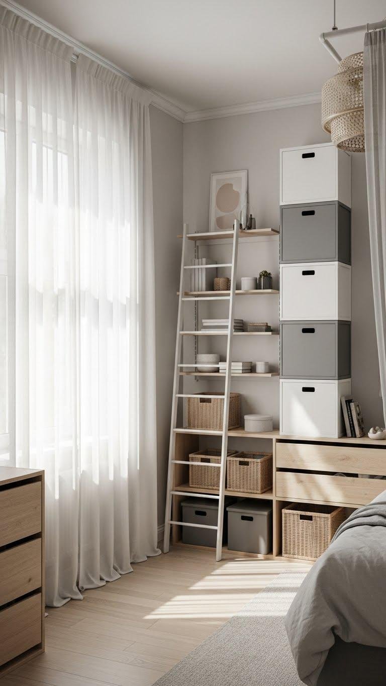 After stretching height with ceiling-to-floor curtains, keep that upward momentum by installing vertical shelving and stacked storage.