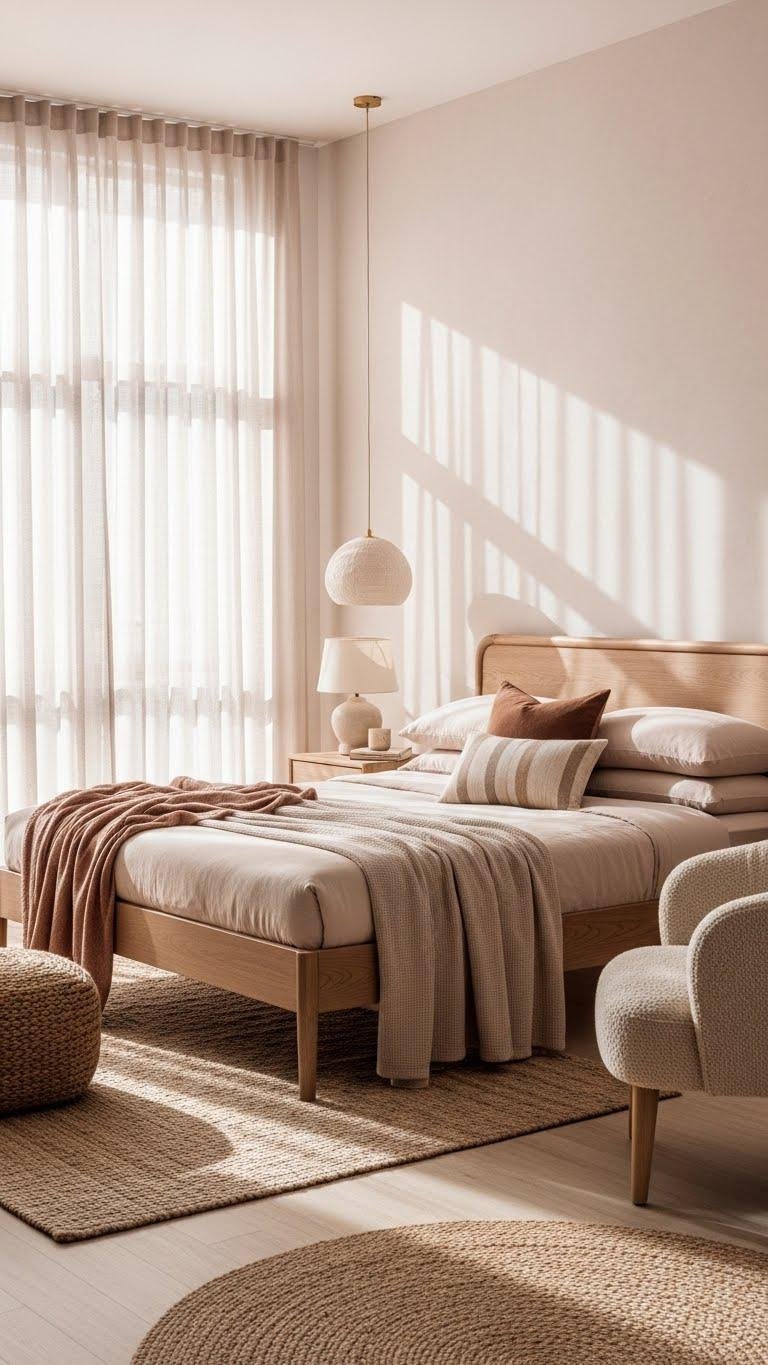 You’ll balance blush neutrals with natural fibers, matte woods, and tactile throws, letting textured accents define depth without clutter. Embrace pared-back patterns, open sightlines, and movable pieces so your bedroom feels freeing, intentional, and quietly luxurious.