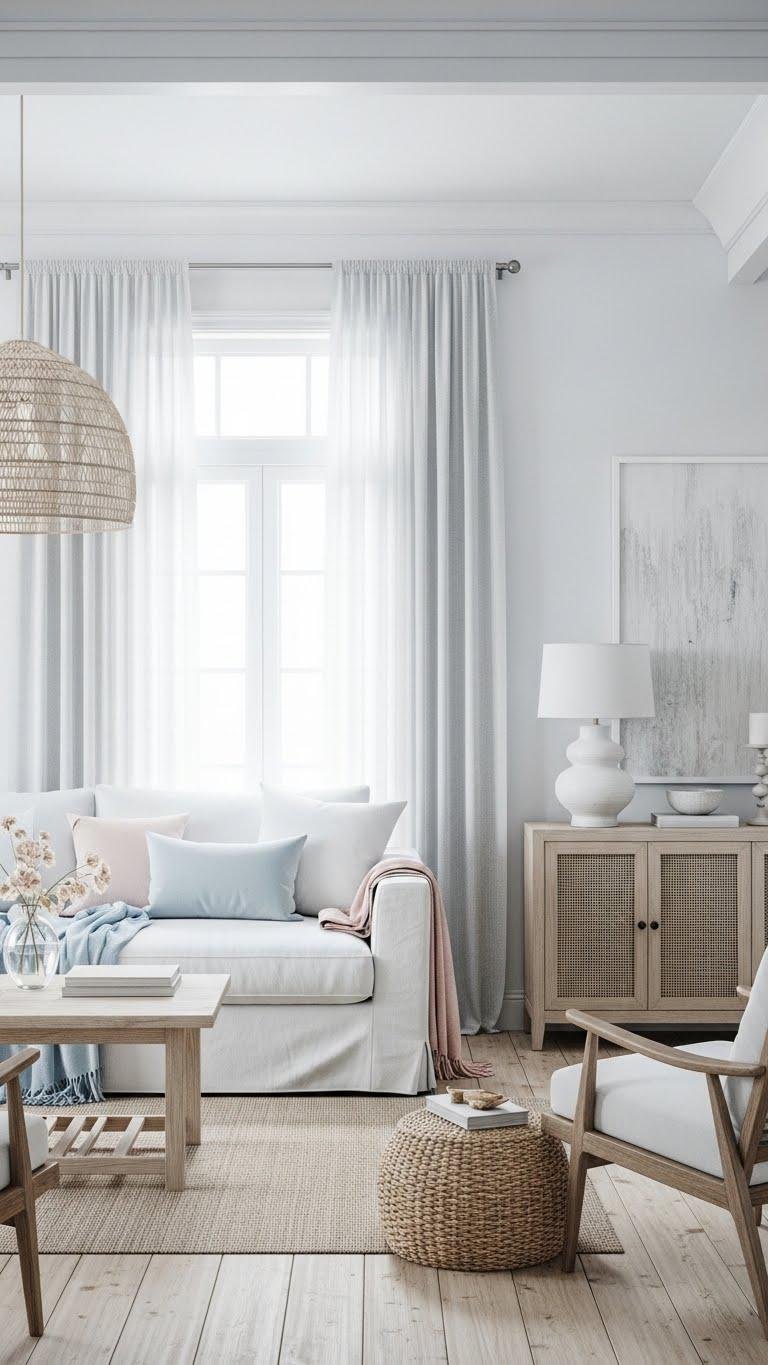 If you want to shift the soft neutral blush mood toward a breezy, seaside calm, swap some warm taupes for crisp coastal whites and introduce soft blues with a few blush accents to keep warmth. You’ll layer airy linens, woven coastal textures, and pale blue throw pillows.