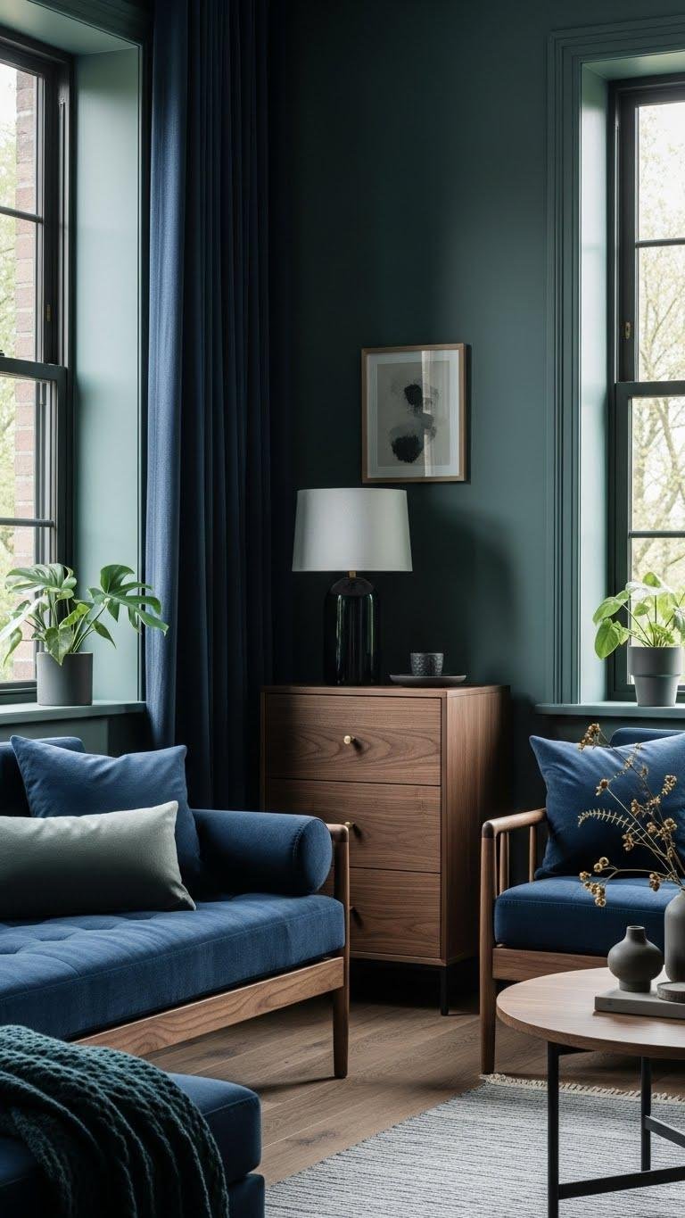 If you loved the quiet warmth of muted earth tones, bring in deep greens and moody blues to add calm depth without losing that sense of restraint. You’ll layer deep teal walls or accents with indigo velvet cushions and drapes, pairing matte woods and brass details for contrast.