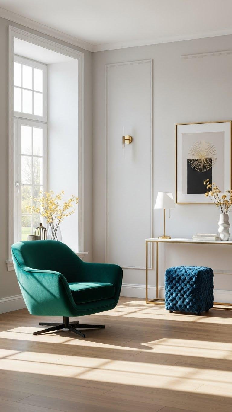Anchor a room with a pop of personality by introducing a colored accent chair or ottoman that sings against your existing palette. Choose an indoor swivel in a bold hue for motion and flirtation, or a compact ottoman in textured velvet to tuck under a console. Mix jewel tones with neutrals, let the piece command joy, and keep the layout airy for freedom to roam.