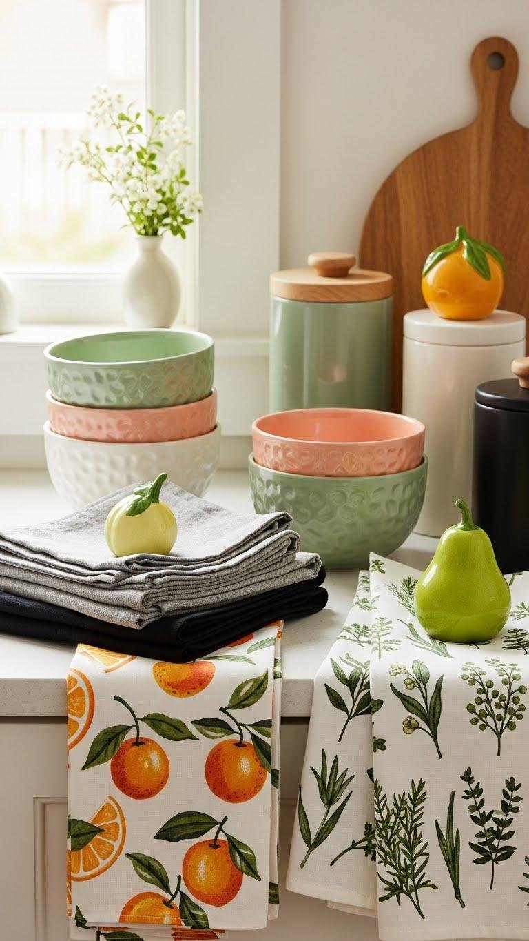 If you’ve mastered monochrome textile stacking, bring a bit of playful nourishment into the mix with fruit-and-vegetable motif accessories that feel modern, not kitschy. You’ll mix citrus patterned napkins with sculptural bowls, pair herb print tea towels with matte canisters, and let singular statement pieces—like a ceramic pear or pepper—introduce whimsy. Keep palettes edited and placement intentional for liberated, fresh energy.