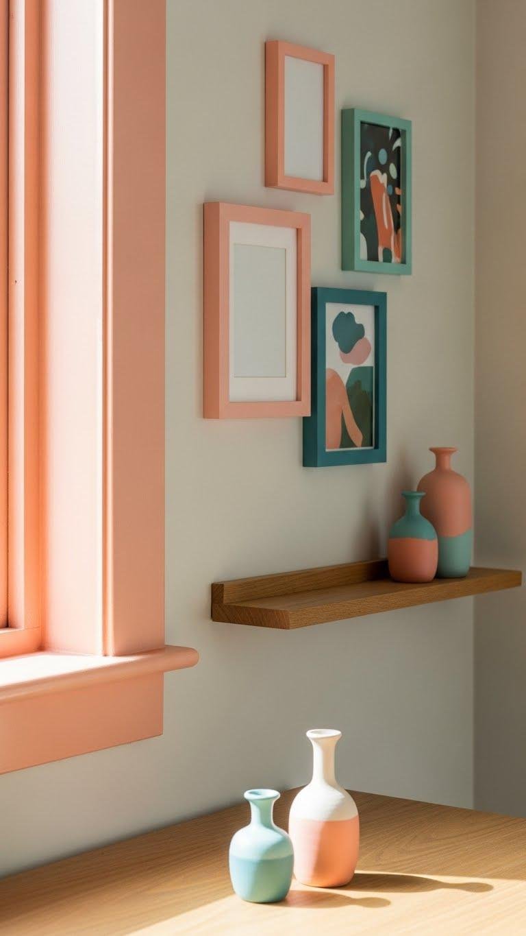 Brighten up a room by introducing colored frames and small painted accents that act like punctuation in your decor—think slim picture frames in melon or teal, a painted windowsill edge, or tiny hand-brushed vases that catch the eye without shouting.