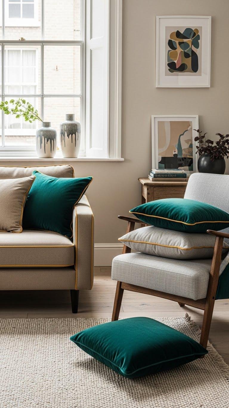 You’ll mix matte linen with bold velvet, add contrasting piping for crisp definition, and choose reversible cushions so color shifts with mood.