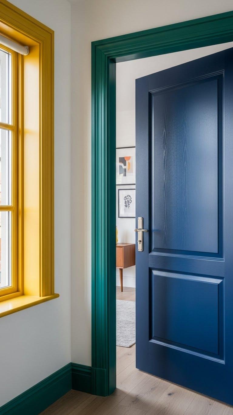 Swap in a punchy trim or door color to give rooms instant character without repainting every surface. You’ll create accent contrast that frames windows, moldings, and baseboards, making architecture sing. Choose saturated navy, sunlit ochre, or forest teal to add edge and freedom to your space. A bold hue delivers door drama and curated personality while letting other elements breathe.