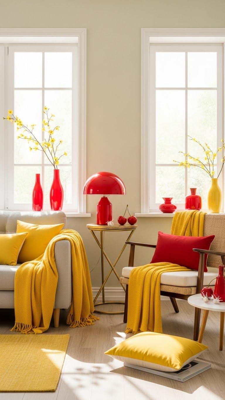 You’ll layer butter yellow textiles—throws, cushions—against pale walls, then add cherry red accessories like vases or lamps to create playful contrast that feels bold, free, and utterly now.