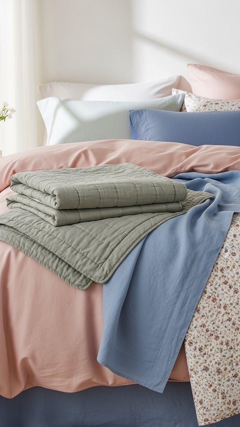 Introduce soft pastels through bedding to instantly soften a bedroom’s mood without sacrificing style: think blush duvet covers, muted sage quilts, and powder-blue linen sheets layered with varying textures so the palette reads sophisticated, not saccharine. You’ll mix a soft pastel palette with a muted ombre duvet, rotate a floral quilt rotation for whimsy, and keep crisp linen accents to feel free and modern.