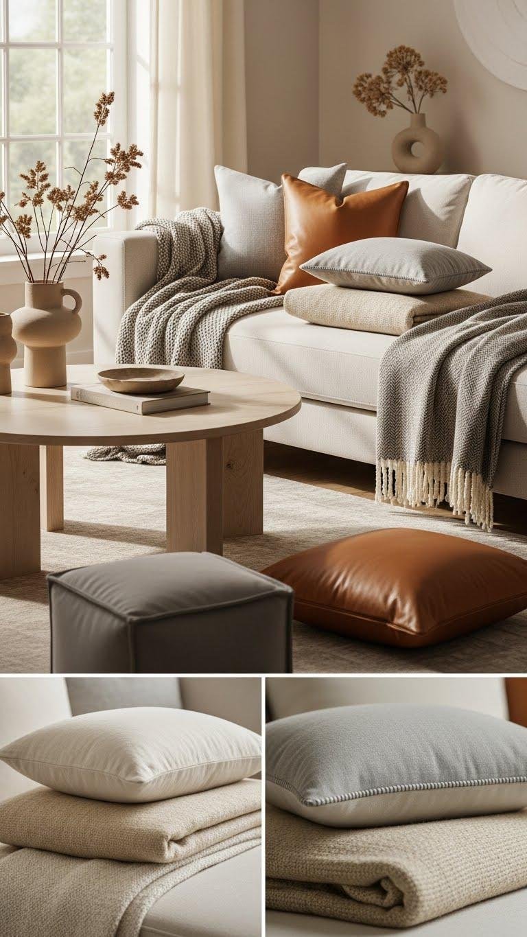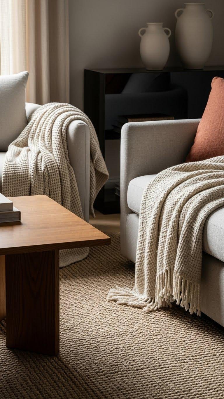 Although a sculptural coffee table anchors the room, layering throws and cushions in coordinated tones brings warmth and cohesion, and you’ll want to be deliberate about it.
