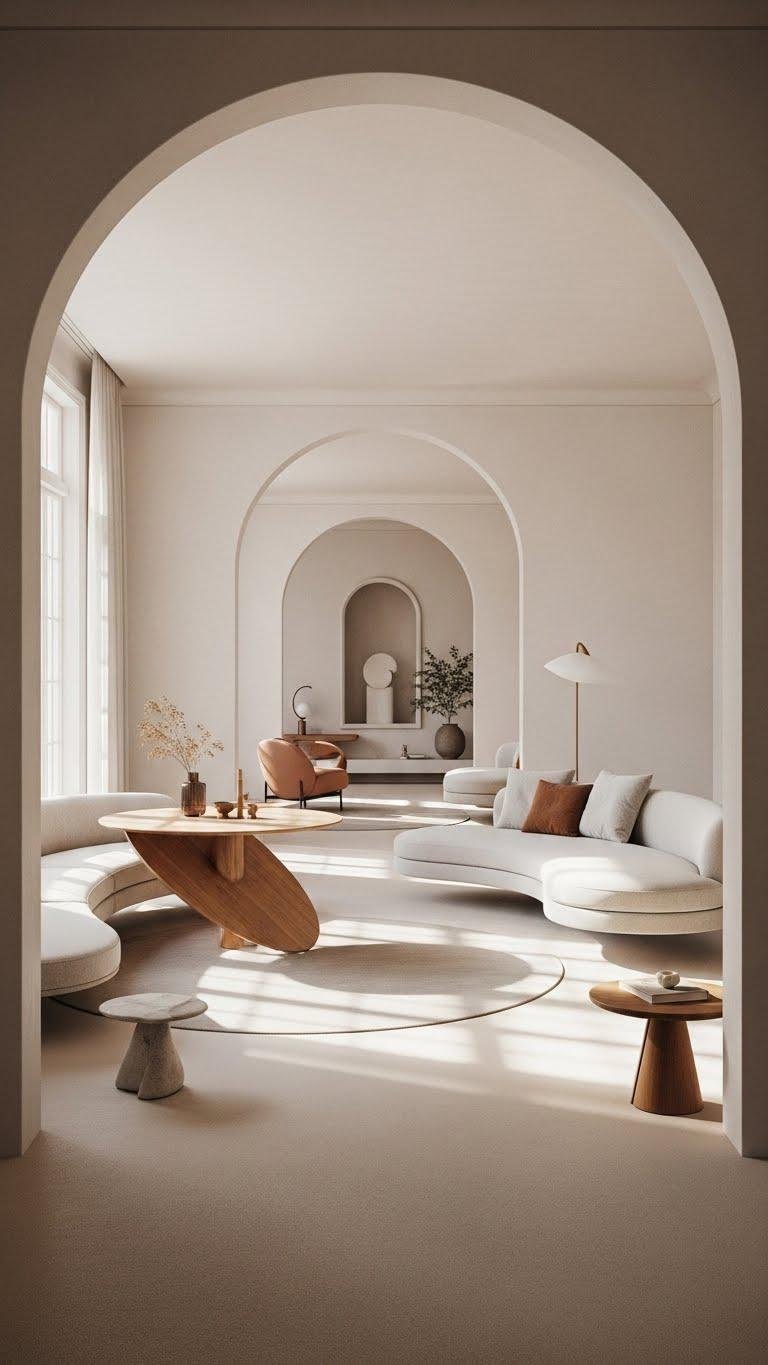 Often you’ll find that rounded furniture and architectural curves invite movement — so arrange pieces to preserve sweeping pathways rather than block them.