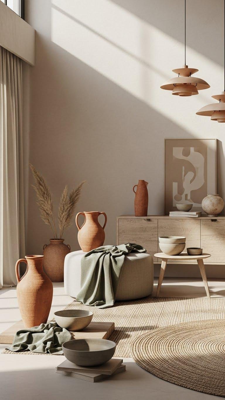 After lifting the eye with subtle ceiling details, anchor the space with muted earthy accents that add warmth and depth without overpowering the calm. You’ll layer pieces in muted clay and fabrics with sage undertones, choose matte ceramics, woven rugs, and low-profile lighting. Let restraint guide choices so every texture, color, and object feels deliberate and liberating.