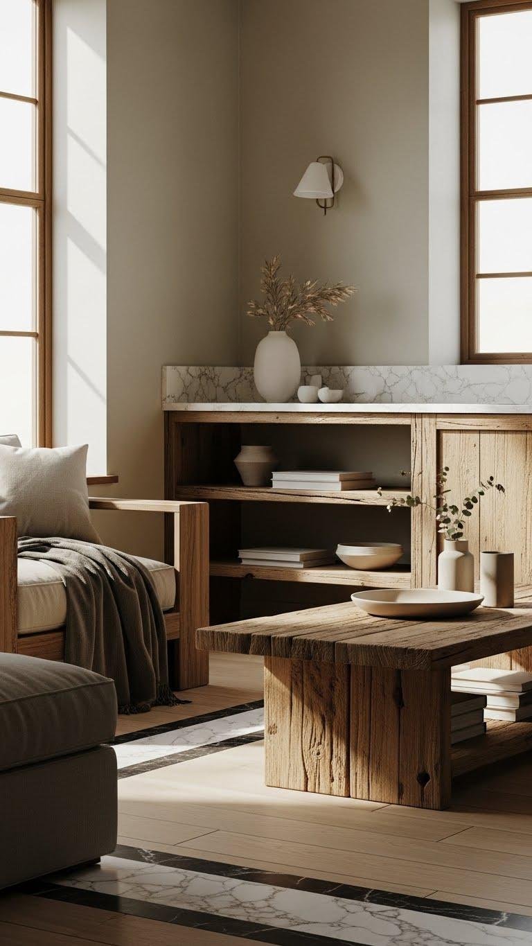 You’ll pair reclaimed timber furniture with sleek countertops or subtle marble inlays to balance rustic soul and modern polish.