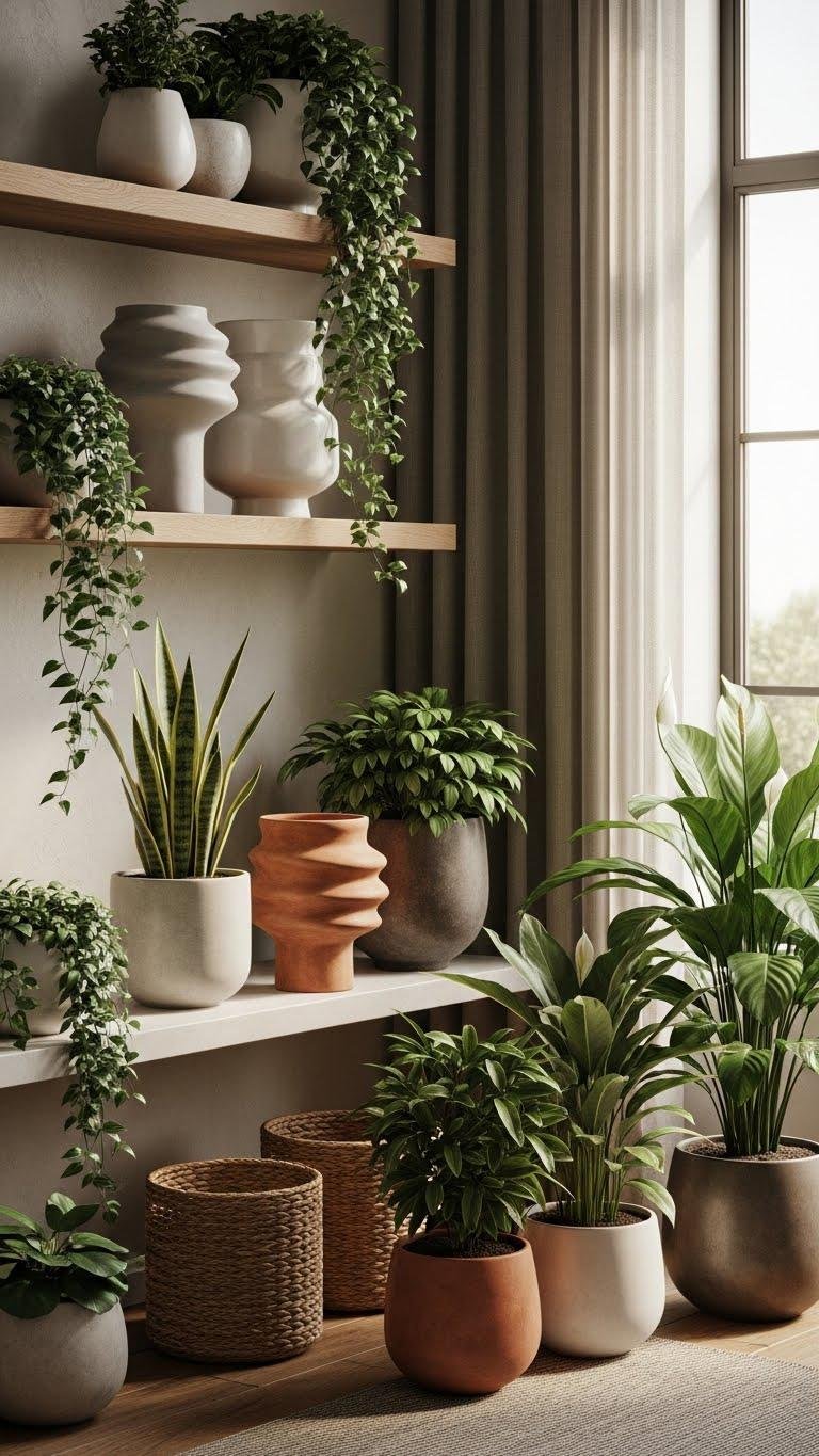 Mix heights and textures, use trailing planters to drape warmth over shelves or banisters, and let maintenance be simple—minimal fuss, maximal presence—so your home feels liberated and grounded.
