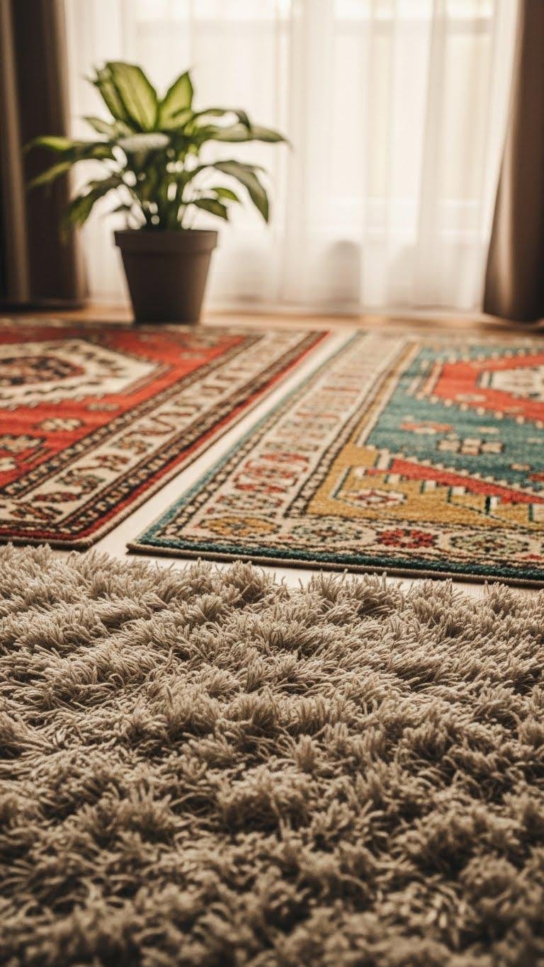 Choose durable weave and colors you love, mix motifs sparingly, and keep pathways clear so the space feels open and free.