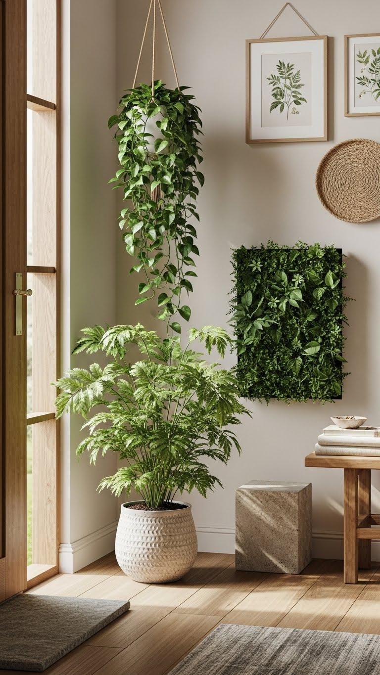 When you bring plants into the entryway, they instantly warm the space and welcome guests with a quiet, natural rhythm. You’ll choose resilient pots, a sculptural fern or trailing pothos, and a compact living wall for drama without clutter.