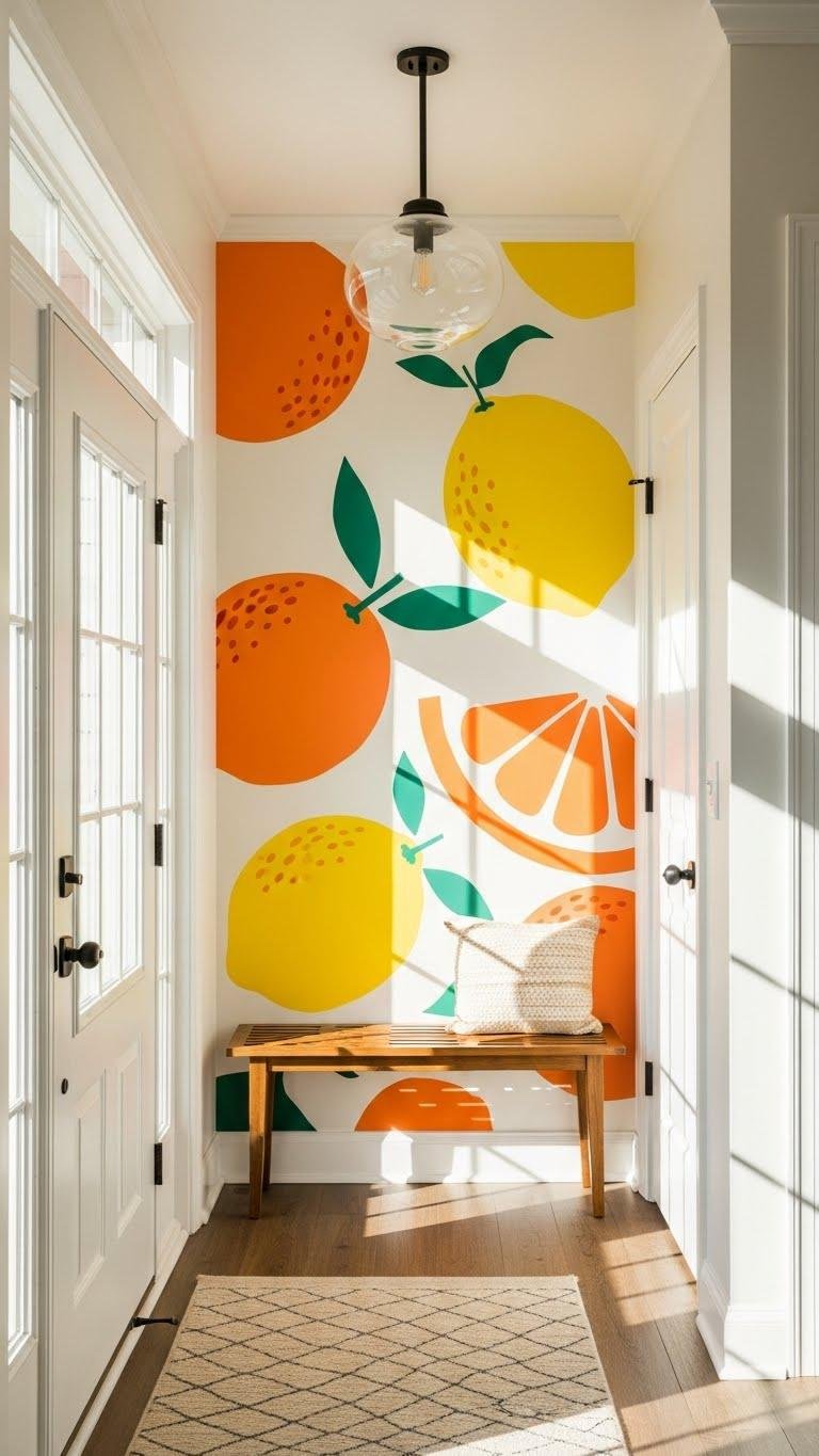 Choose bold, freeing hues for a sunlit foyer — think lemon or tangerine pops. Citrus murals add playful, graphic energy without clutter. Pair with simple hardware, a streamlined bench, and natural light to keep the space inviting and intentional.