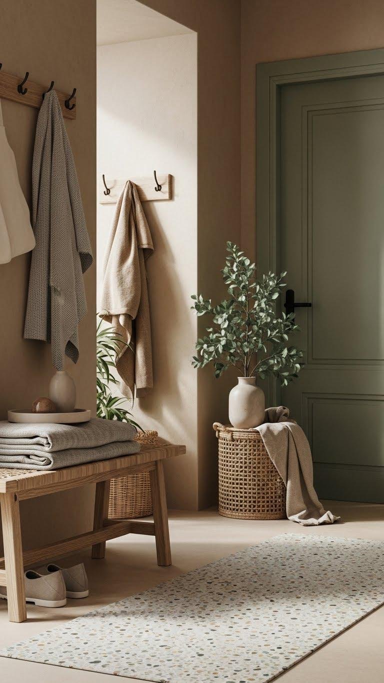 Because earthy beige and soft green echo the tones of soil and new leaves, they create an entry that feels grounded and quietly alive; pair warm beiges with muted sage to balance warmth and freshness. You’ll layer textured linens, natural wood, and a muted terrazzo runner for subtle pattern. Keep accessories minimal, add a woven basket for shoes, and choose soft matte finishes for effortless calm.
