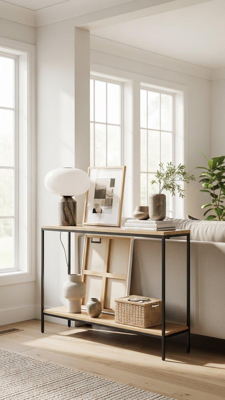 You’ll pick a narrow console that defines flow, create an anchoring vignette with a lamp and art, and mix layered textures—wood, metal, woven—to keep it relaxed.