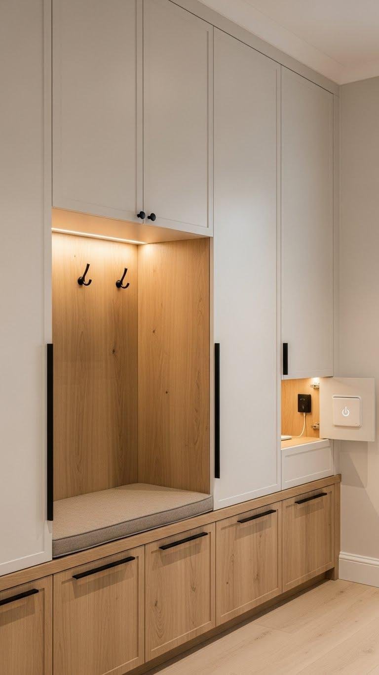 Define your entry with built-in wall panels that hide storage while adding architectural polish. You’ll get an integrated bench for quick sits, soft close cabinetry for quiet order, and hidden charging banks to keep devices ready.