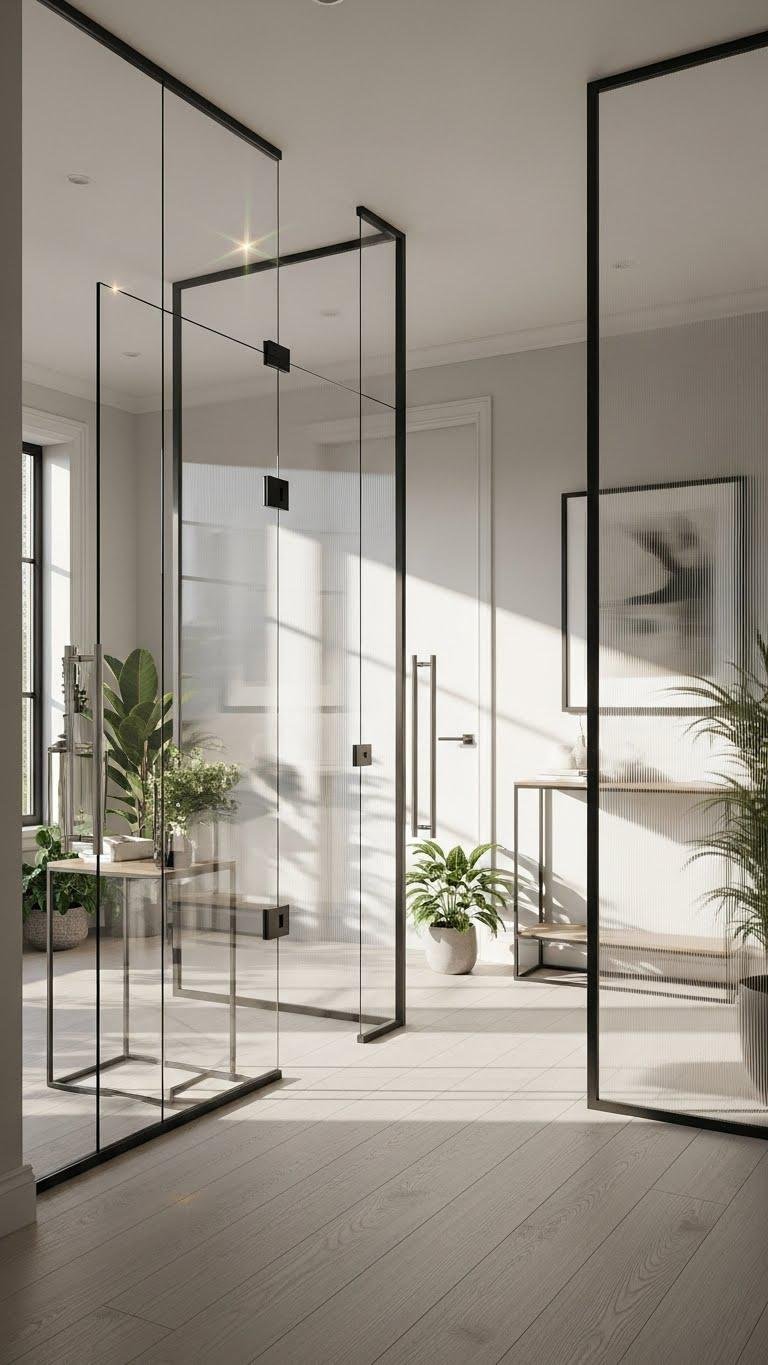 When you bring glass into the entry, it opens sightlines and lets light do the decorating for you—transparency feels modern and effortless while still defining zones.