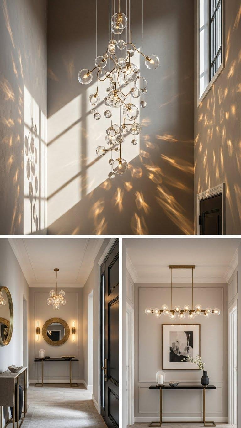 A statement chandelier can instantly set the tone the moment someone steps in, so choose a design that balances scale with the entry’s proportions—think a sculptural cluster for high ceilings or a slim linear piece over a console in tighter foyers. Let crystal mobiles catch daylight and orb pendants float like art; pick finishes that reflect your freedom, then hang confidently for effortless impact.
