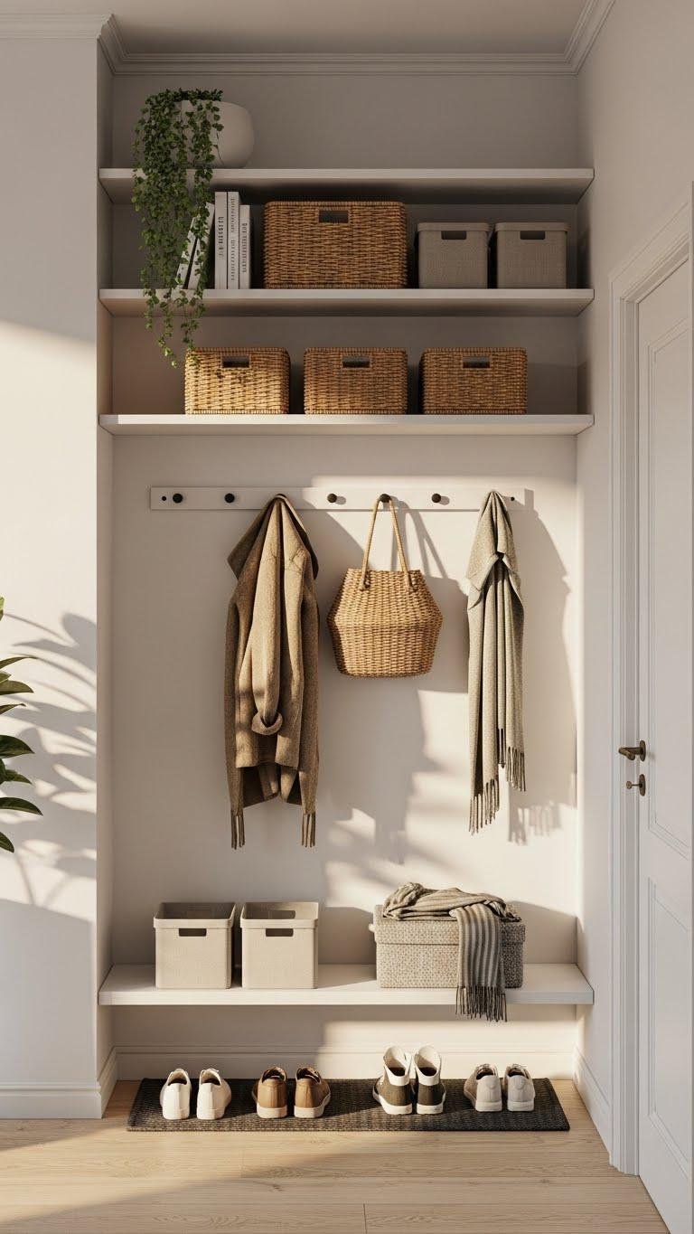 You’ll create airy storage using a woven floating basket mix and minimalist bins, keeping shoes and scarves tucked away.