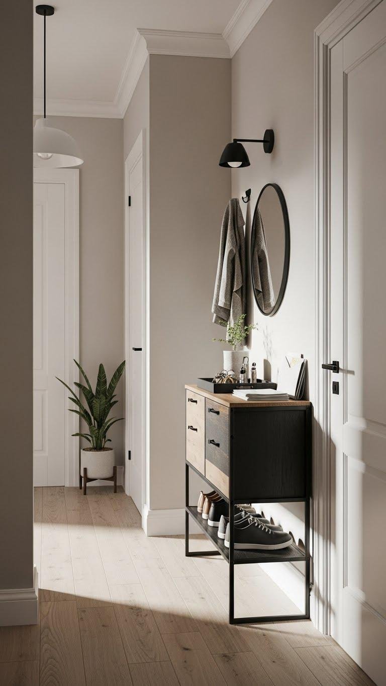 If you liked the streamlined look of a built-in bench, a slim console table with drawers keeps that same clean silhouette while adding surface space and hidden storage. Choose a piece with a narrow silhouette, tapered legs, and matte finish so you can style freely. Drawers with hidden hardware preserve minimalism while stashing keys, masks, and chargers, keeping your entry calm and uncluttered.