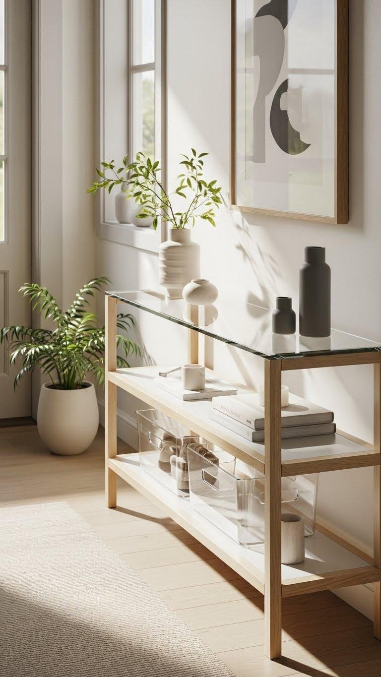 Often you’ll choose a glass-top console when you want entryway storage that reads light and modern; its transparent surface lets light pass and keeps visual clutter to a minimum.