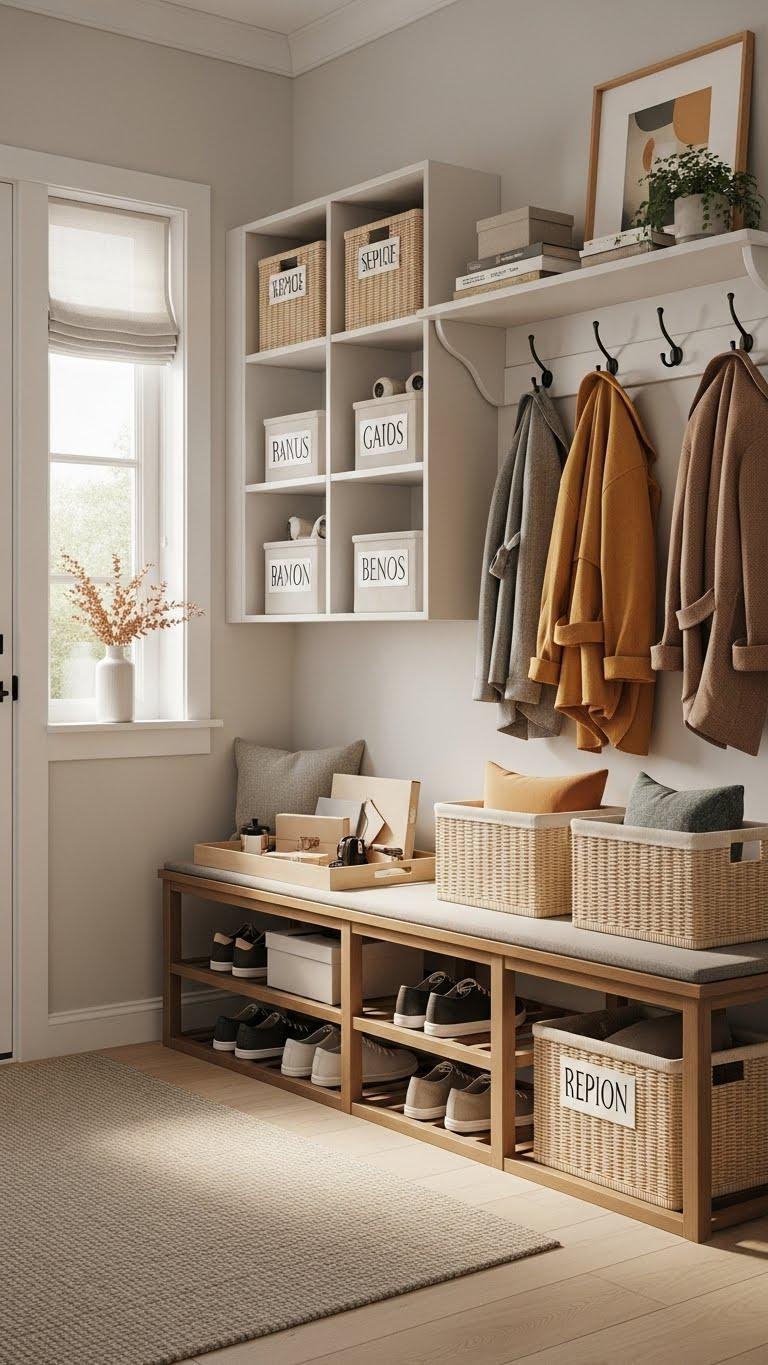 Pull together a calm, efficient entry by fitting open cubbies with labeled bins—each slot becomes an intentional drop zone for everyday gear. You’ll love the freedom to grab and go; use color coding for family members and pattern mixing to keep it lively.