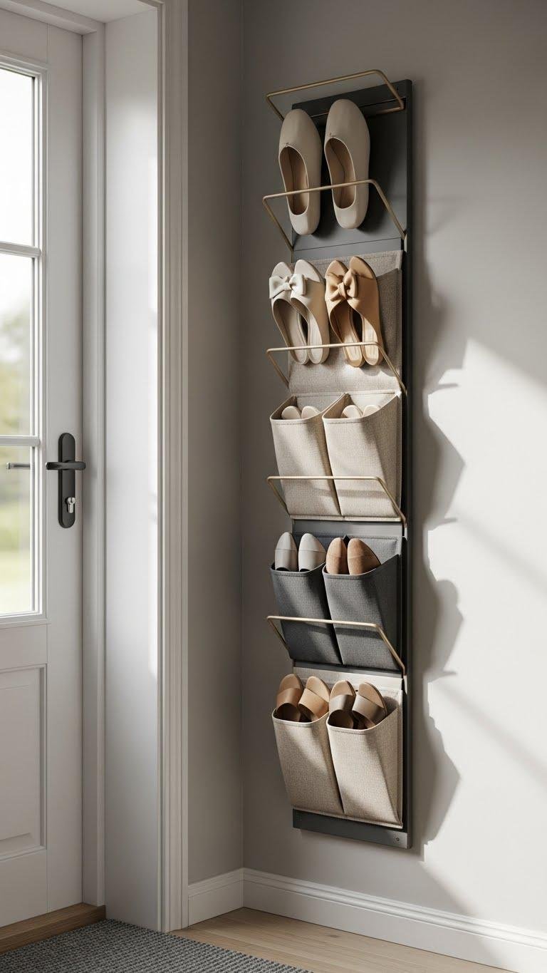 You’ll free movement and keep entryways airy with a vertical organizer featuring staggered shelves or hanging pockets for flats and sandals.