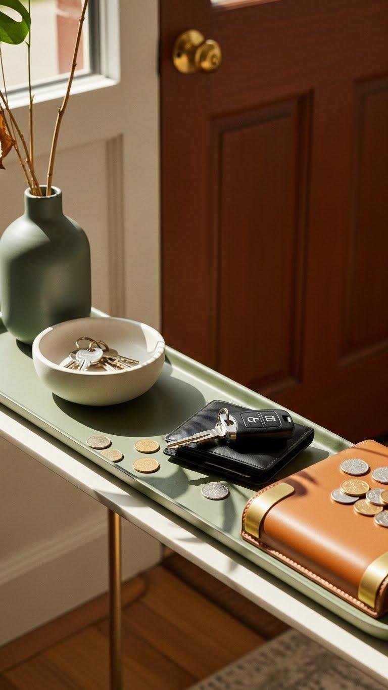Tuck a slim console tray by the door to corral keys, wallets, and loose change so you never scramble for them.