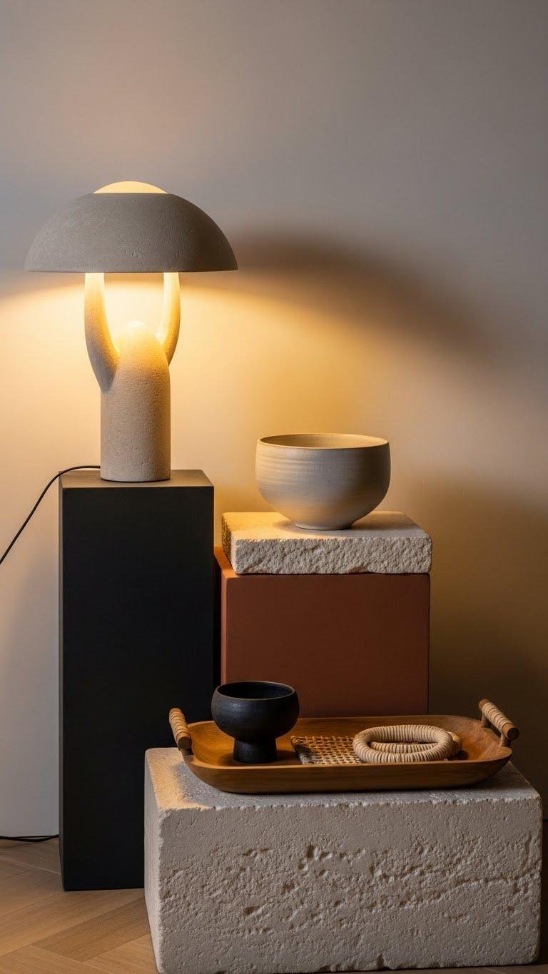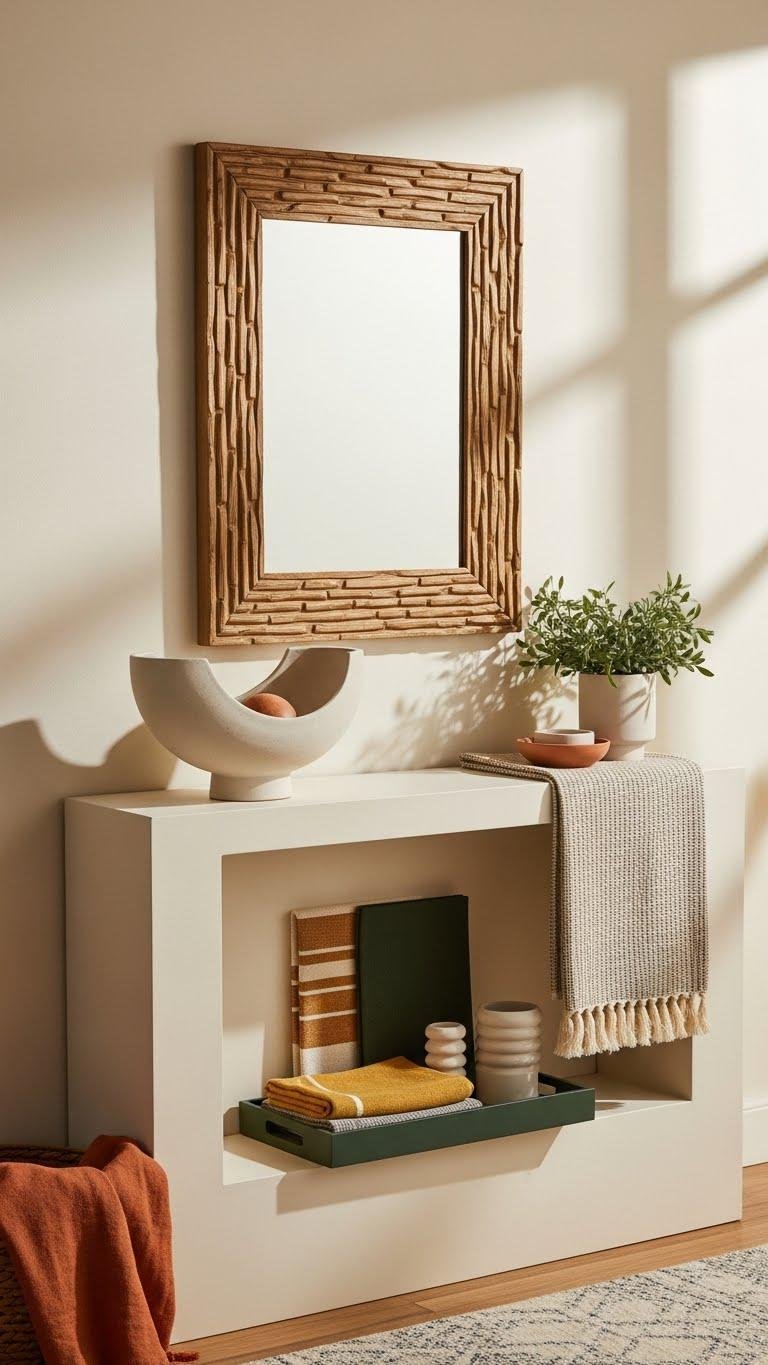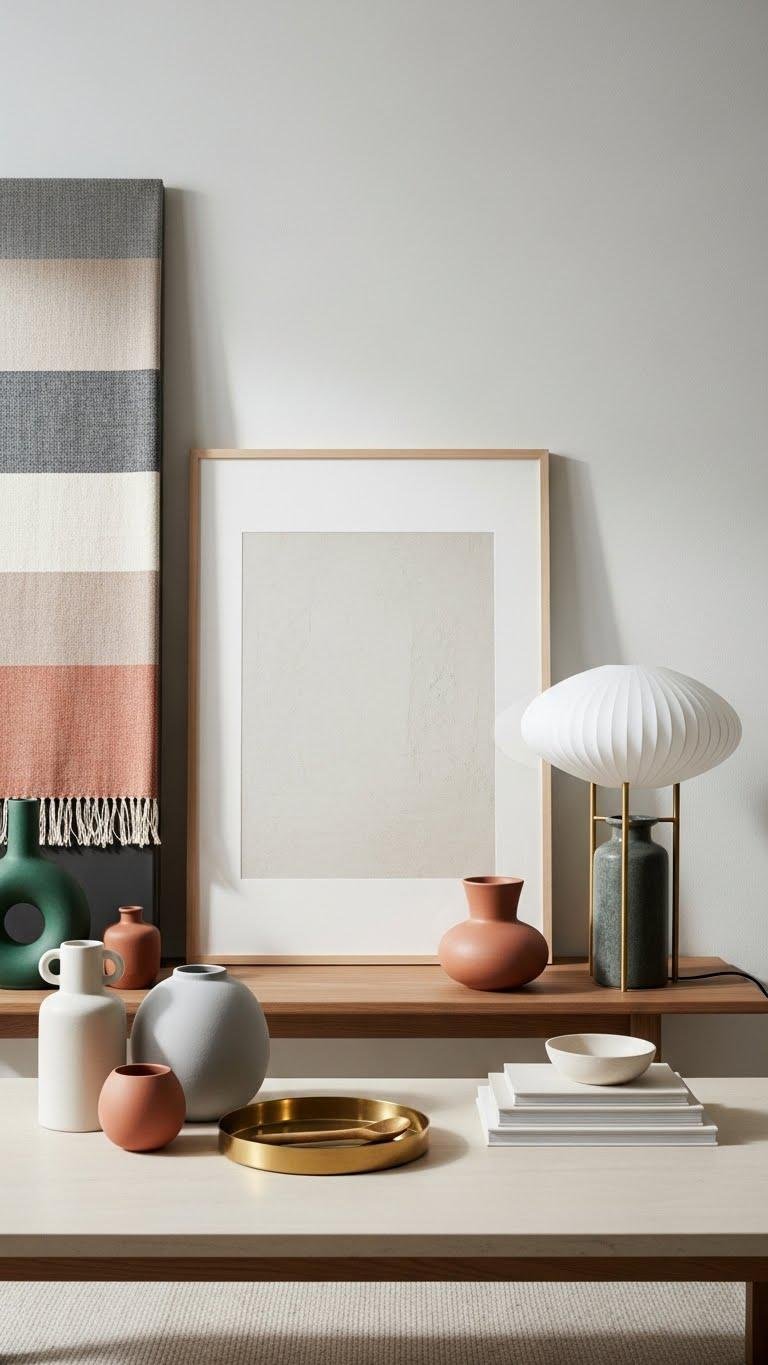 You’ll pair vertical textiles or leaning artwork with low ceramics, a tray, and a stack of slim books. Let negative space breathe so the arrangement feels free, curated, and modern.
