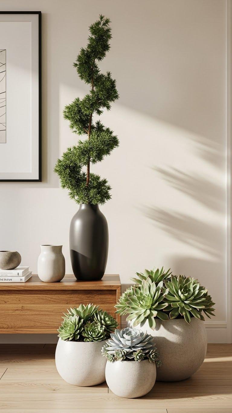 Choose sculptural evergreen stems for permanence and texture, then add low maintenance succulents in matte pots for modern edge. You’ll enjoy a liberated, polished entry that feels intentionally edited—minimal fuss, maximum impact, and always welcoming at a glance.