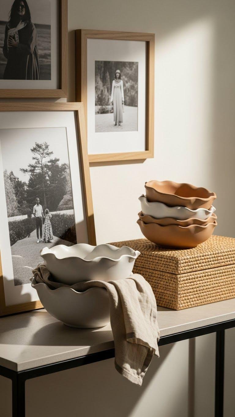 After you’ve set a few framed photos to anchor the entry, add tactile interest with ruffled ceramic bowls and woven boxes to keep the look curated, not staged.