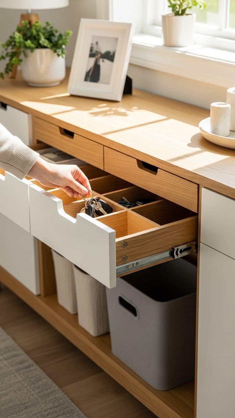 Prioritize drawer organization with dividers for keys, mail, and tech.