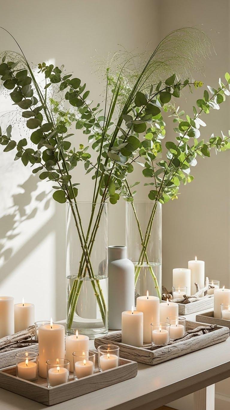 Pull together breezy coastal charm by pairing tall leafy stems with clusters of simple candles to evoke sea-salted air and relaxed evenings.