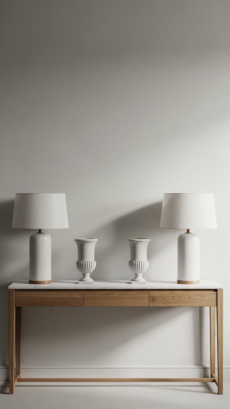 A pair of matching lamps or vases flanking your console instantly reads as deliberate and calm, so choose two pieces with clean lines and a shared material to keep the look minimal and modern.