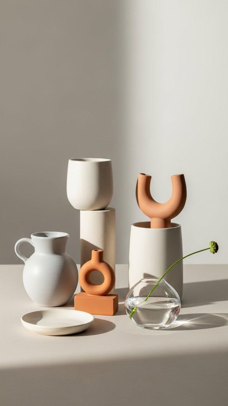 Pair a matte glaze vase with a sleek blown-glass carafe and a reclaimed teak tray; keep shapes minimal, colors restrained, and arrangements deliberately breezy for a liberated, curated look.