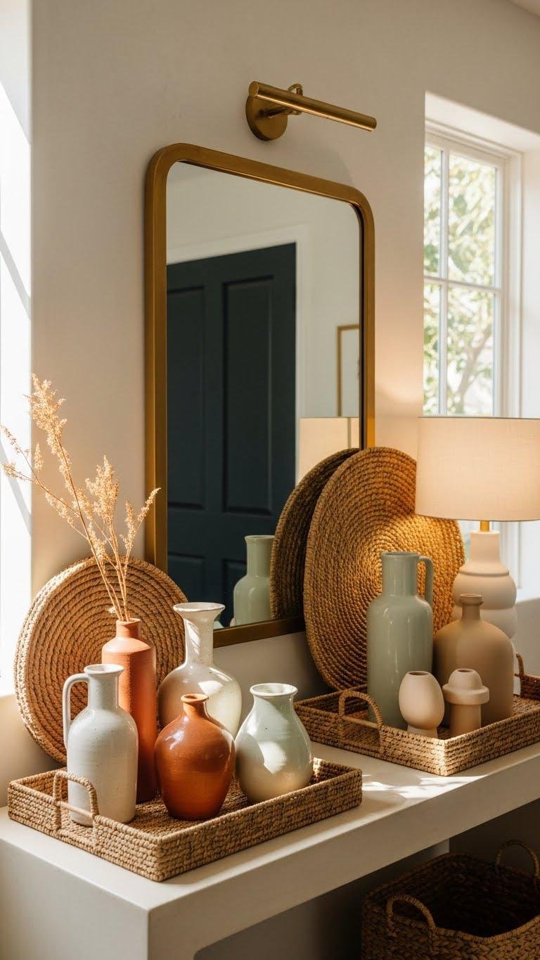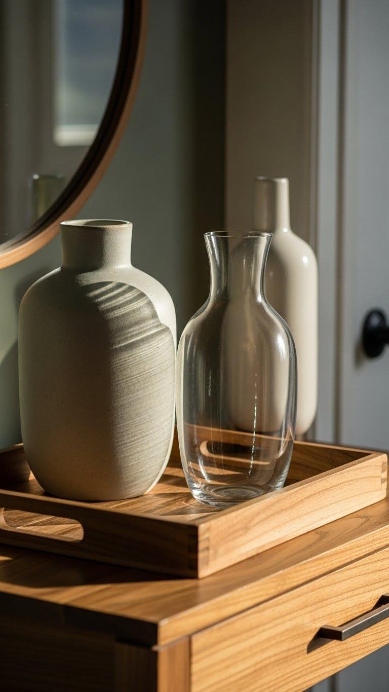 While mixing ceramic, glass, and wood, let contrasting textures do the talking—you’ll balance the cool clarity of glass, the hand-made weight of ceramic, and the warm grain of wood to create a layered, intentional entry vignette.