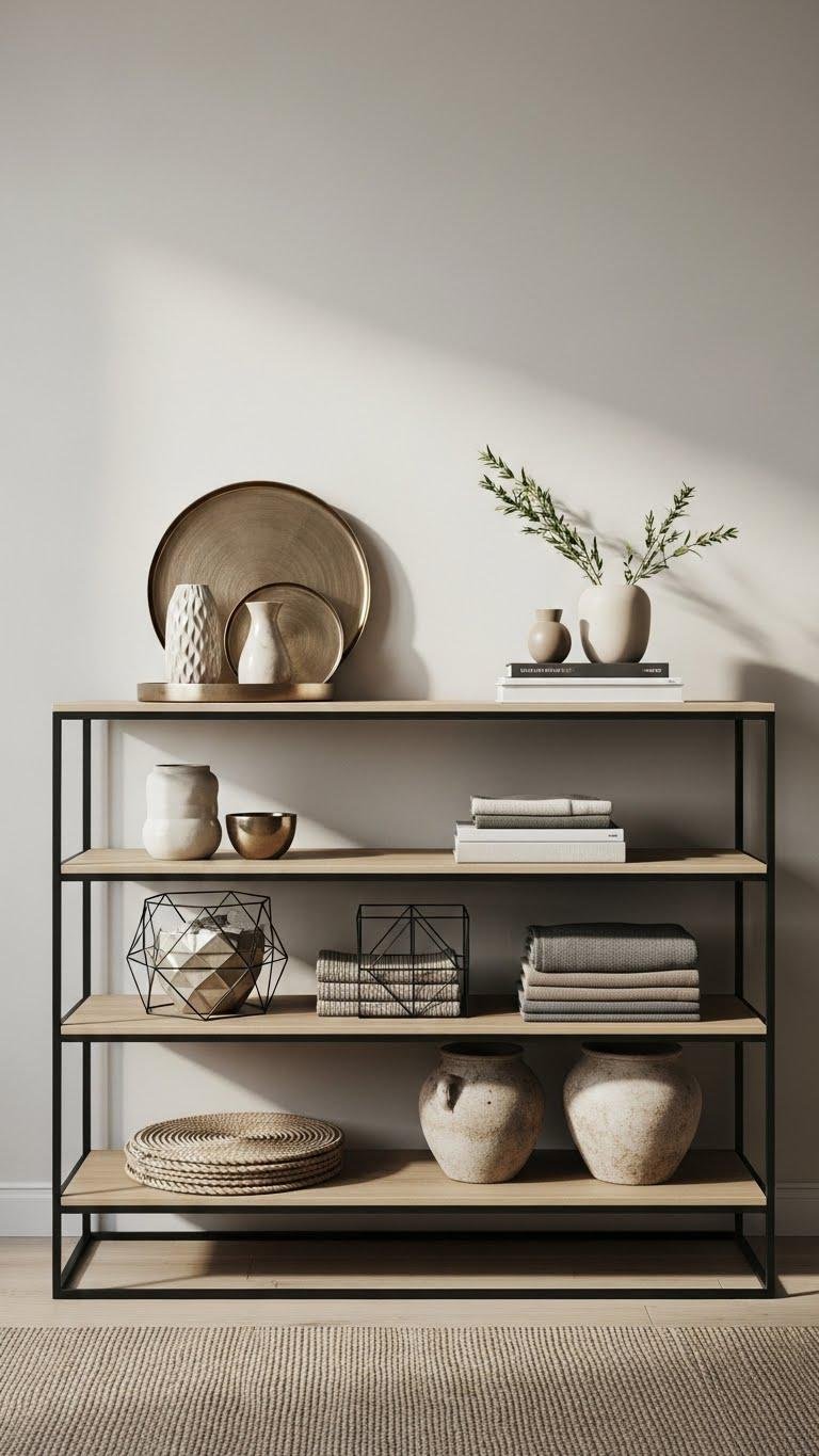 Layer a three-shelf modern console to create visual depth without clutter—organize items by scale and frequency of use so the top shelf reads like a curated vignette, the middle offers artful storage, and the bottom anchors with texture.
