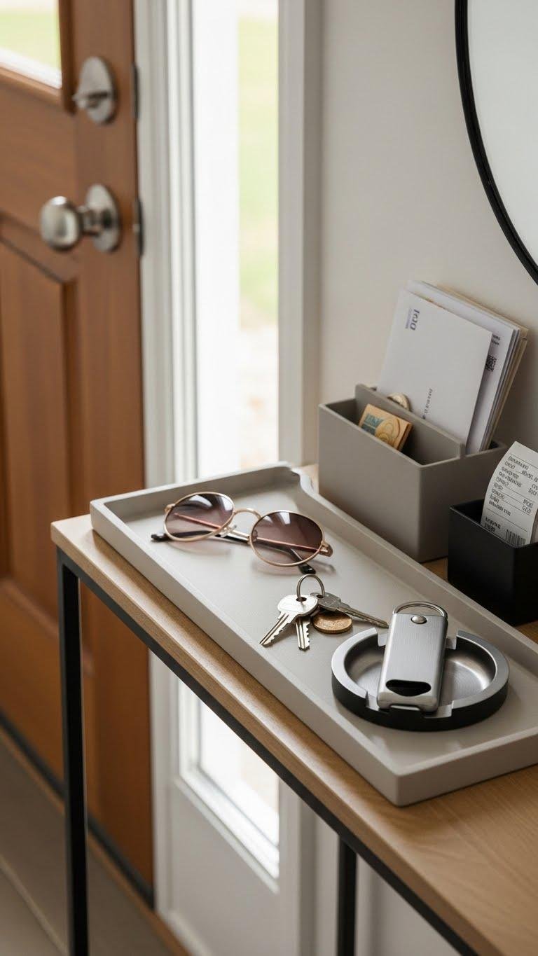 Tuck a low-profile tray by the door to corral keys, sunglasses, mail, and that handful of everyday essentials so your entryway reads as edited, not chaotic.