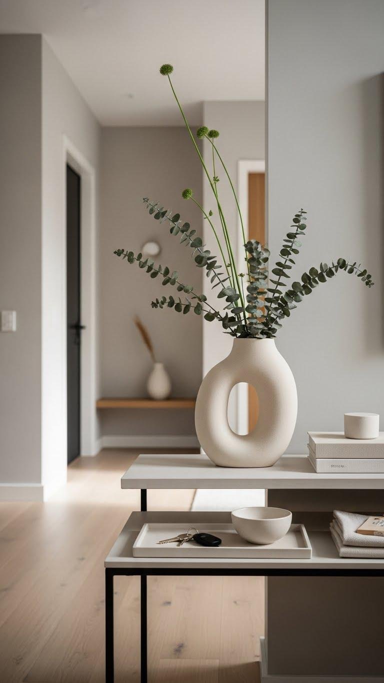 After you’ve corralled the everyday essentials on a low-profile tray, bring life and personality to the console with a statement vase and a few fresh or faux greens. Choose a sculptural vase that feels liberated, then add dried eucalyptus or minimalist stems for height and movement. You’ll create an effortless focal point that reads modern, curated, and easy to maintain.