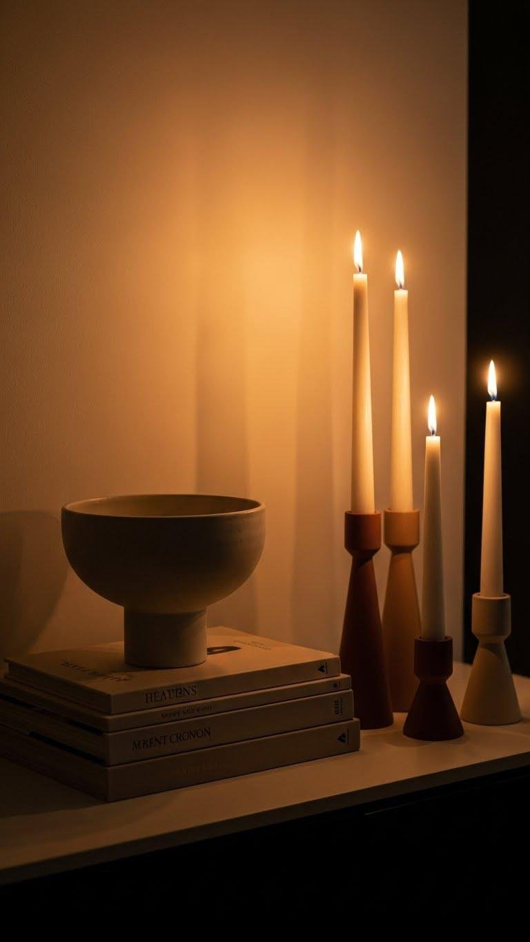 Once you’ve lifted a sculptural bowl or photo on a neat stack of books, introduce candlesticks to add warmth and a touch of drama. You’ll play with candleholder symmetry—pair matching heights or balance mismatched pairs—leaning into a tapered silhouette for elongation.